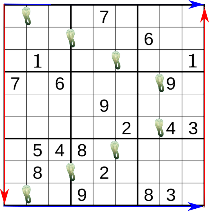 Ordinary sudoku rules DO NOT apply. Please read carefully. This puzzle takes place on a klein bottle. The top and bottom of the grid are glued together--they obey periodic boundary conditions (see the example on the left). The left and right side are twisted and then glued together (see the right side). The little klein bottles denote the separation of two horizontal 9 square "klein rows." Each column and box behave normally. Every column, box, and klein row must contain the digits 1-9 exactly once. You may notice that the 1's in the puzzle are in the same "ordinary row" but they are separated by a klein bottle and are therefore in different klein rows. Let me know if anything is unclear in the comments :)